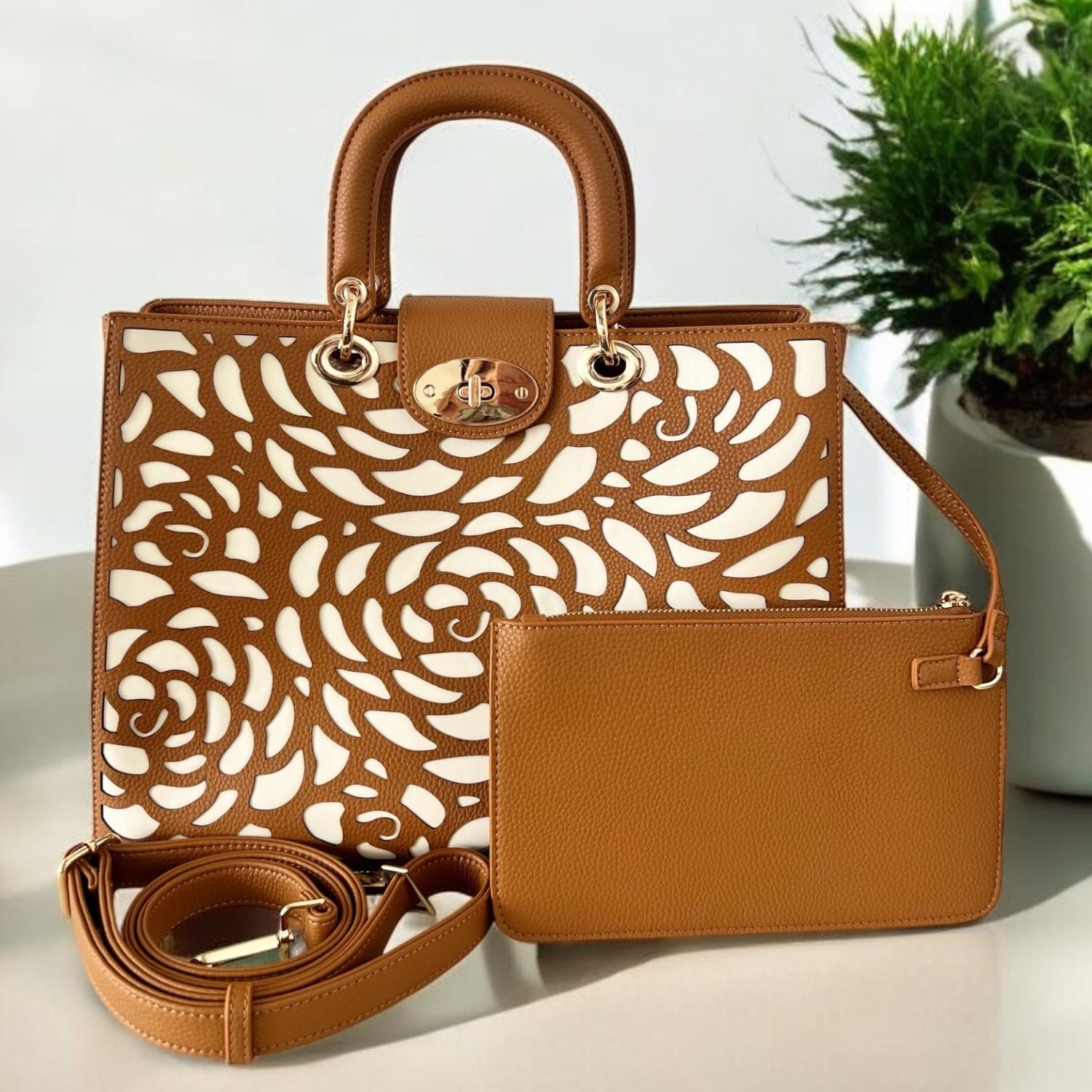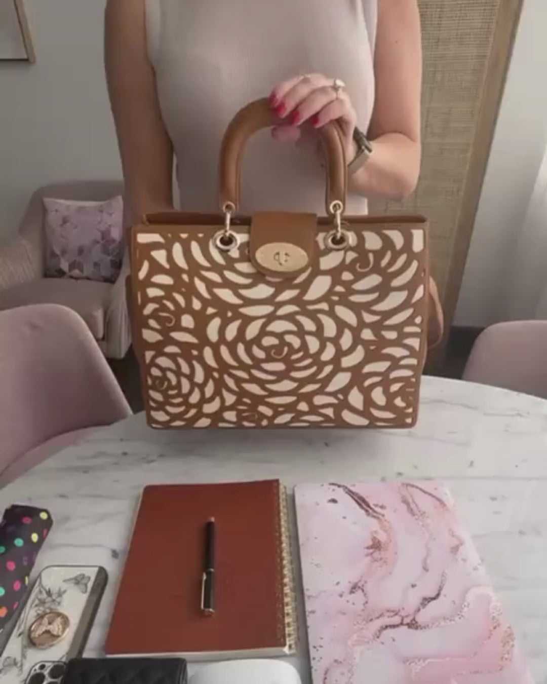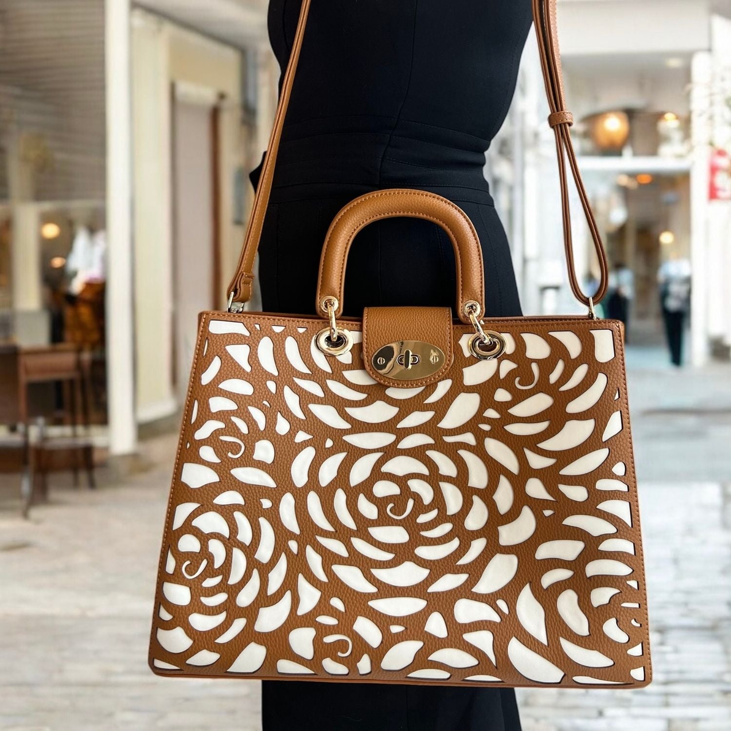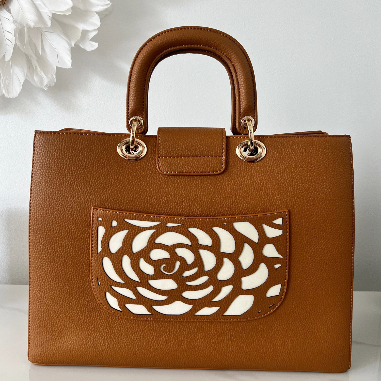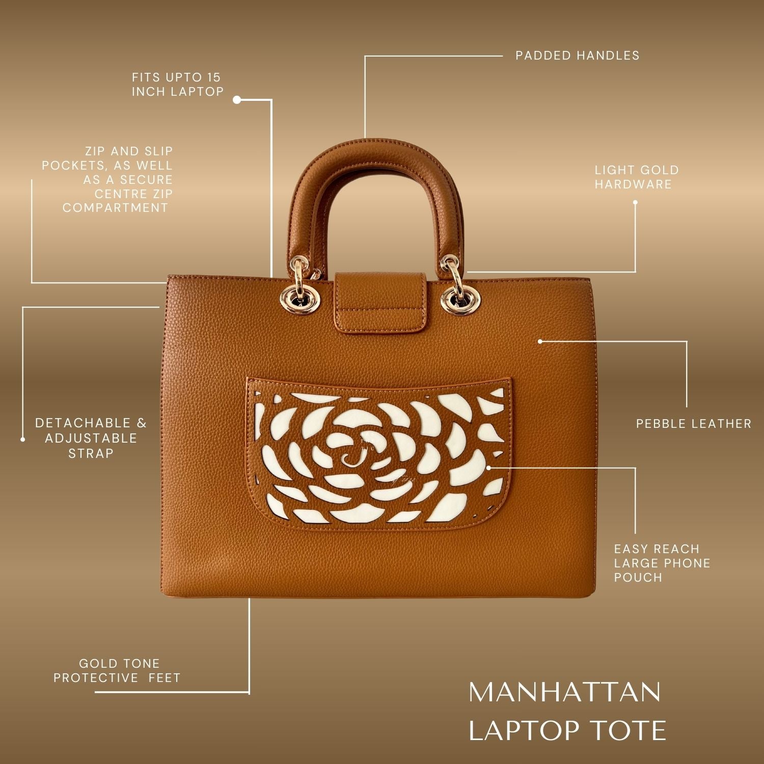 Crafted in luxuriously textured pebble vegan leather with our signature laser-cut rosette design, the Manhattan turns heads before you've said a word. The turn-lock closure, padded handles, and light gold hardware are details borrowed from the world of designer fashion. The laptop compartment, smart internal organisation, and signature external phone pocket are details born from real life.