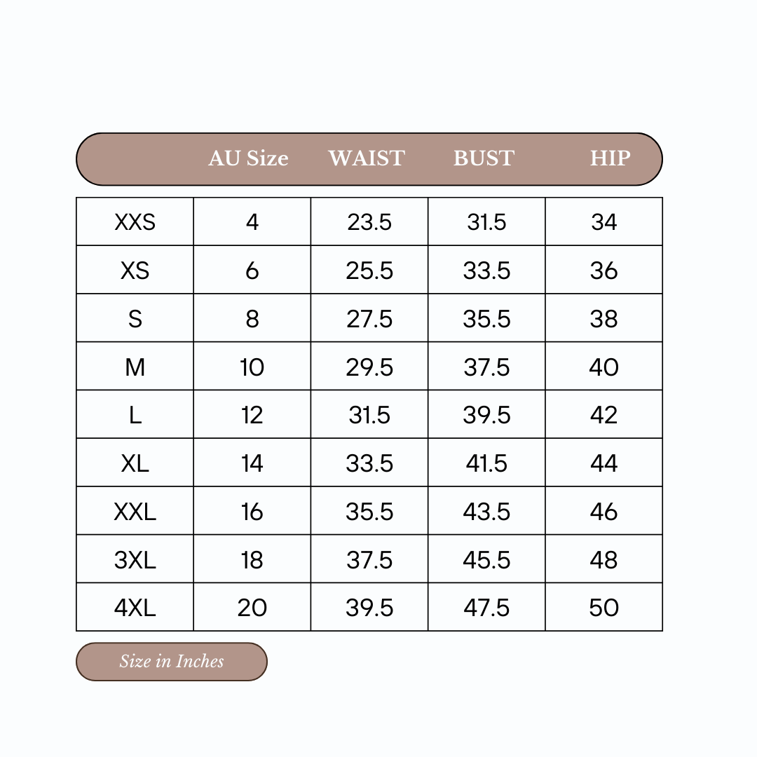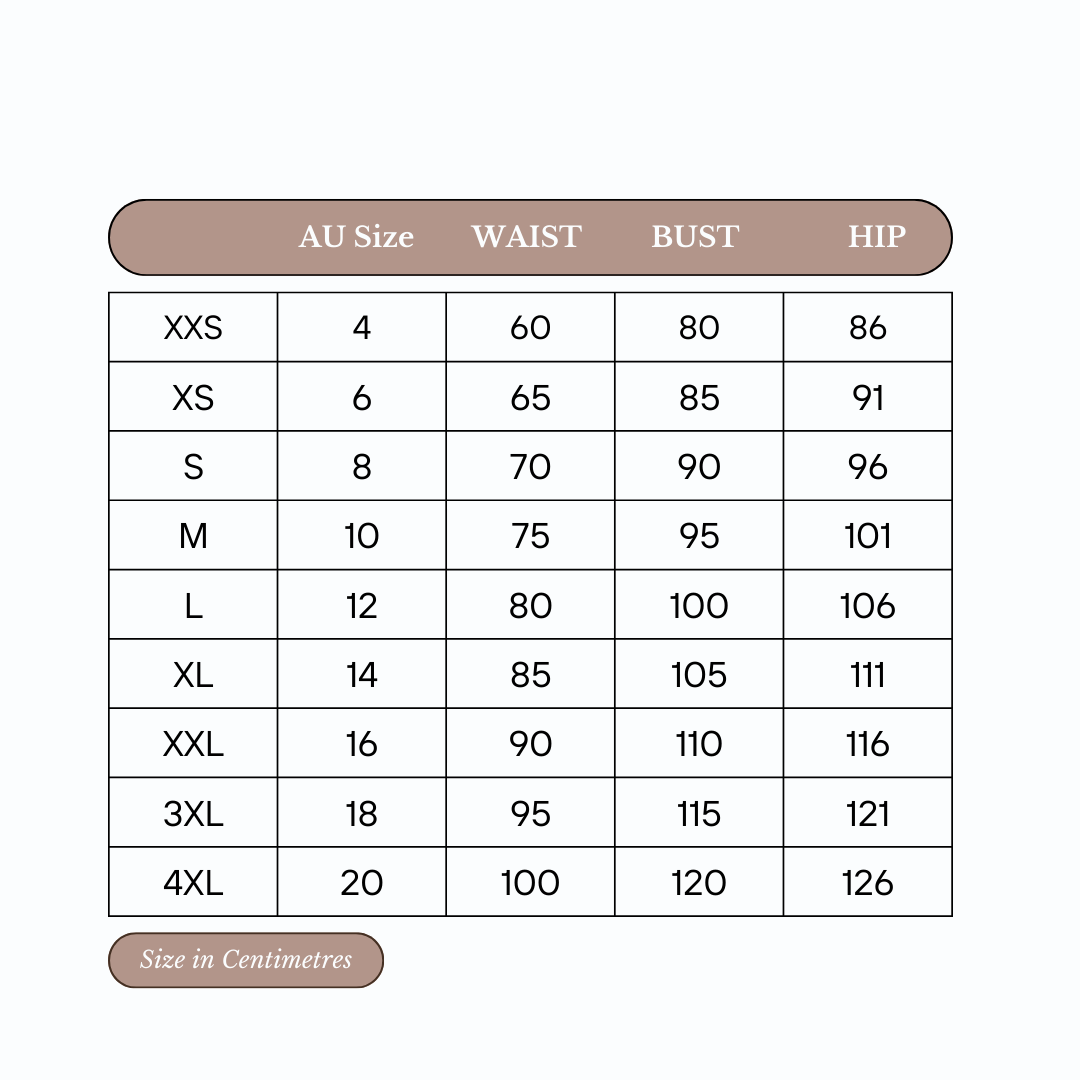 Firstly, let's talk about the DEER YOU size chart. This brand uses the Australian (AU) size system, which may be different from other size systems you are familiar with. Here, the primary measurements to consider are the waist, bust, and hip measurements.
