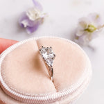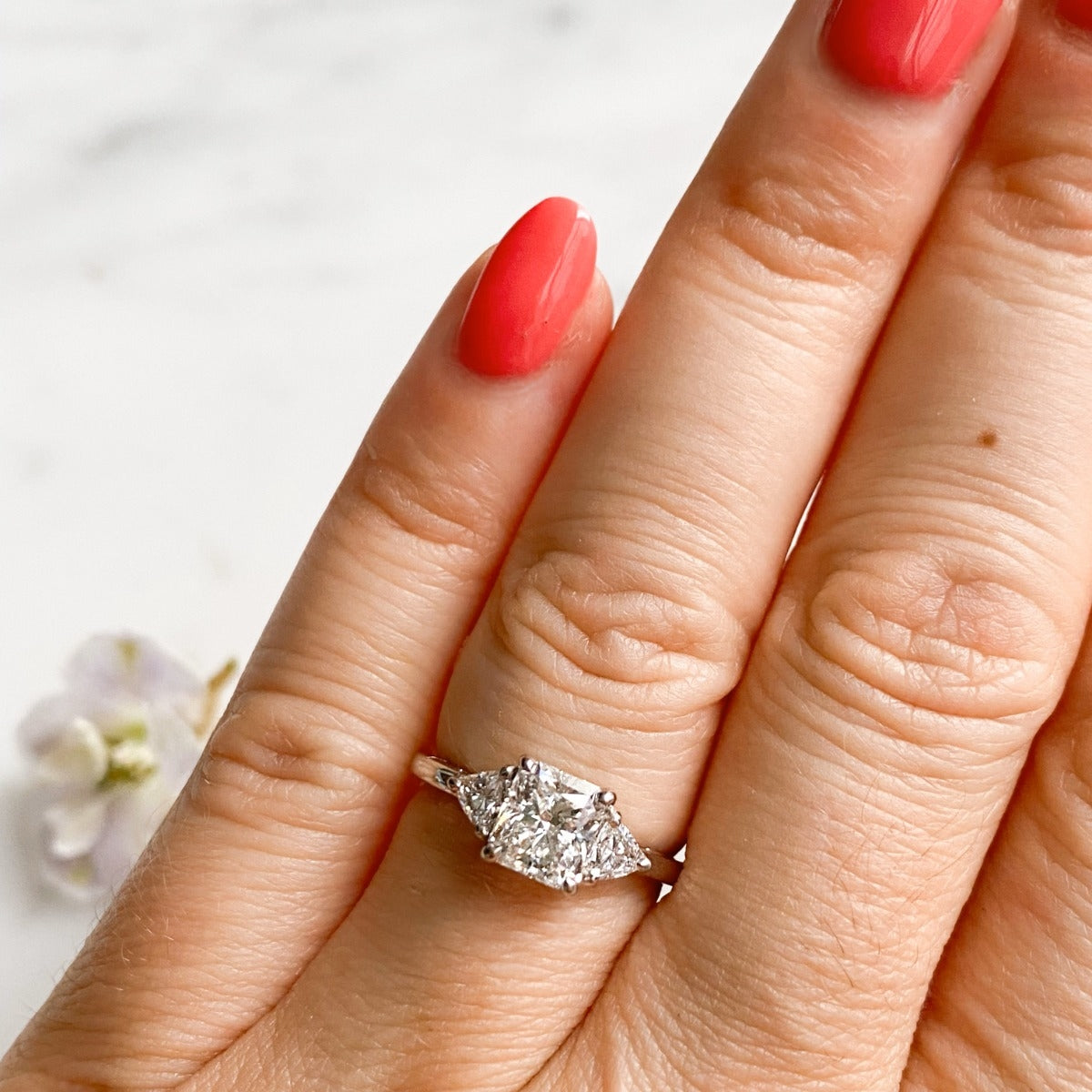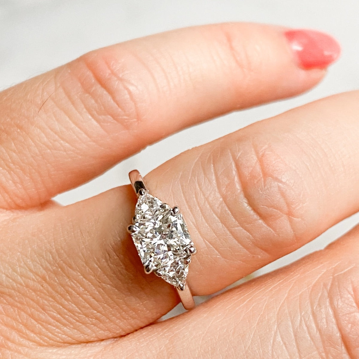 The April ring is a stunning three-stone design with a radiant cut centre stone and trillion side stones. It features a low set basket and delicate claw prongs for a classy and feminine look.