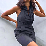 Command the room in this ruffle halter dress that skims the frame and highlights your curves. Designed for afternoon to after party.