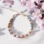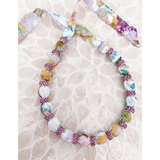 Wrap yourself in luxury with this elegant necklace, crafted with brilliant European crystal beads on rich cotton fabric. Designed to make a statement, this versatile piece can be worn as a classic choker at 42cm or extended to a striking 55cm for a more relaxed look. The soft pastel pattern not only creates a feminine romantic mood but also highlights the sparkle of each purple crystal bead, creating a mesmerizing effect.