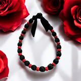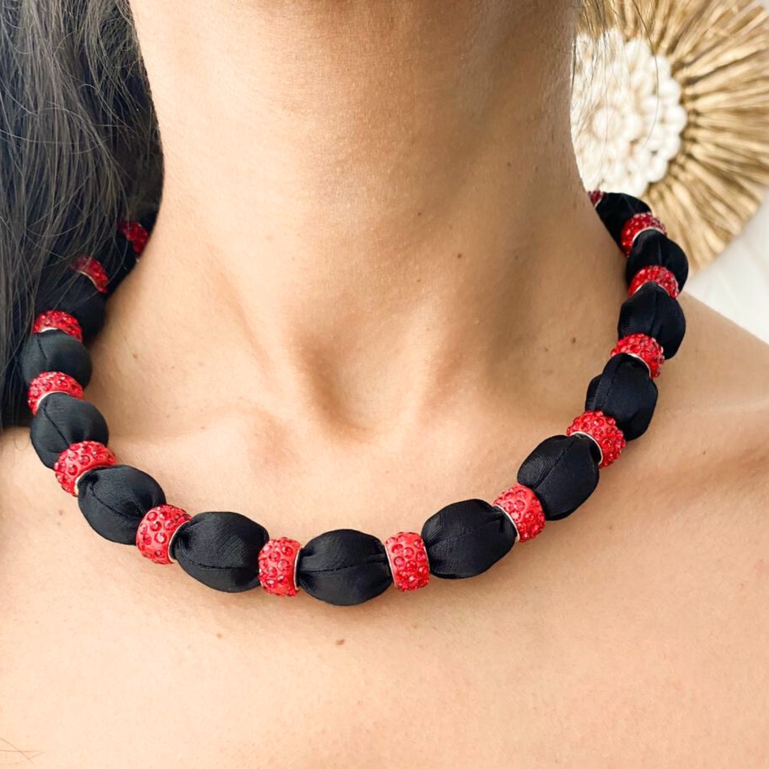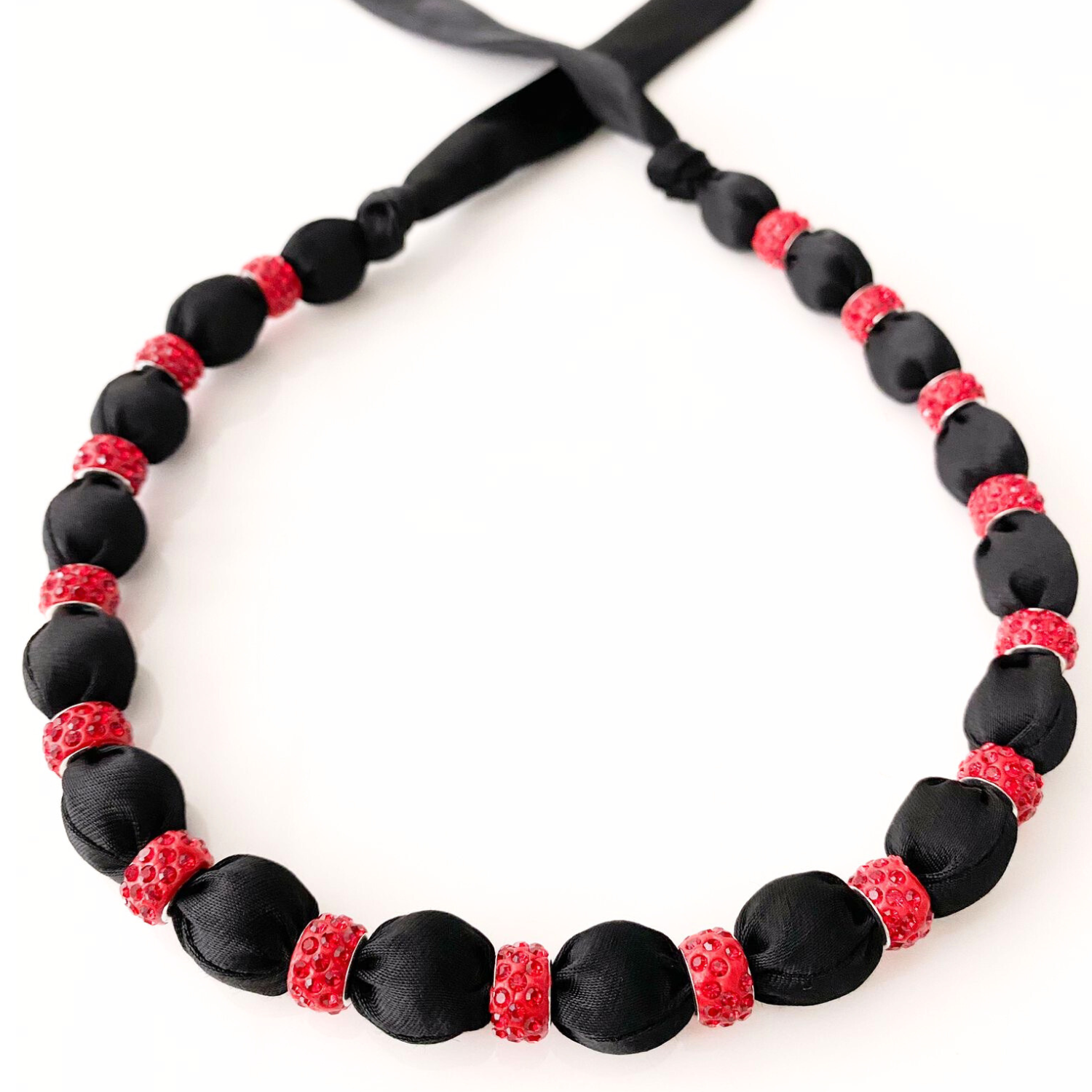 Crystal Embellished Beaded Necklace on Luxe Black Satin with Red Crystals