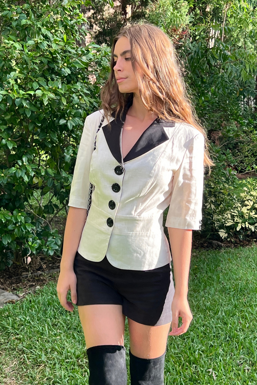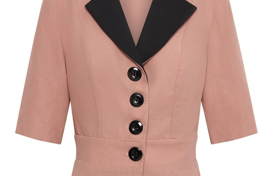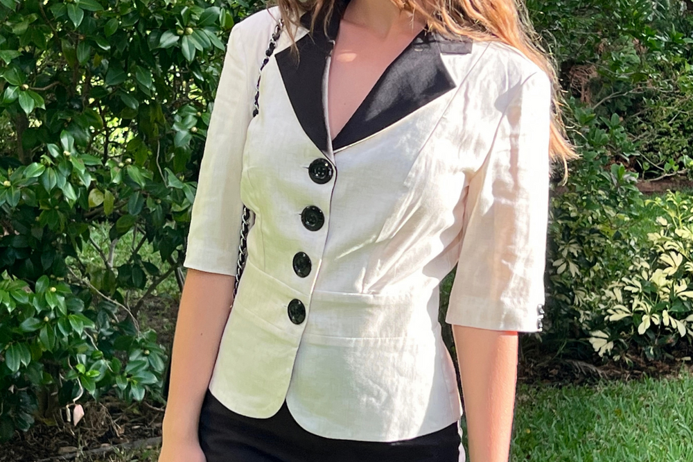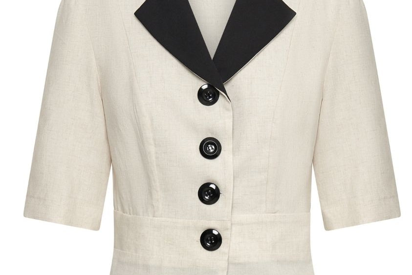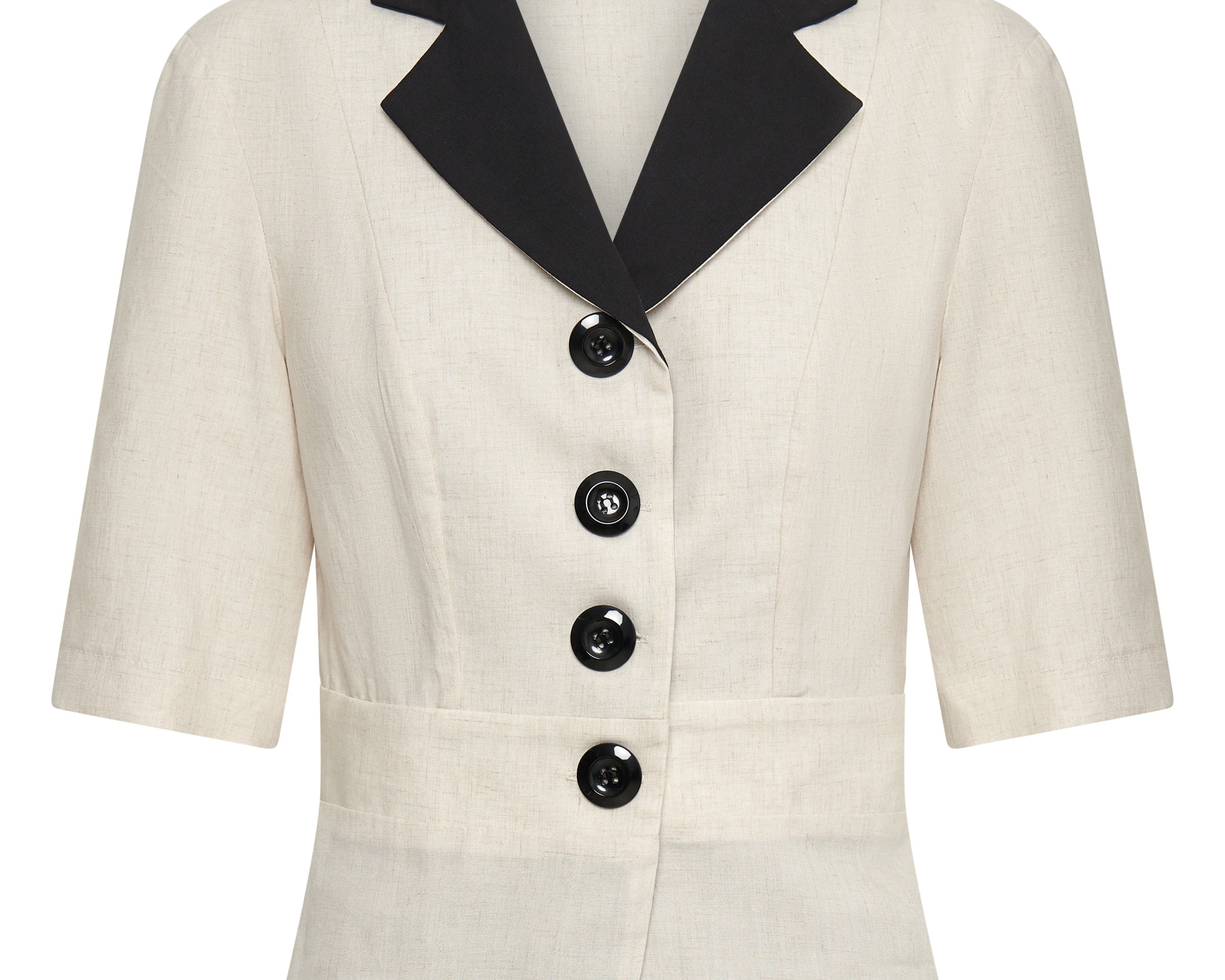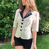 The set features a chic jacket with V-neckline on the jacket to complement all bust sizes. and 3/4 sleeves on the jacket for added arm coverage and easy front button opening on the jacket for effortless wear. The stylish shorts are slightly flared with an invisible back zipper for a streamlined look.