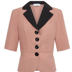 The Iris Igniting Jacket is an elegant wardrobe essential, offering the perfect blend of comfort and sophistication. Made from a premium mix of 30% linen and 70% Tencel, this jacket provides a soft, breathable feel with a polished look. Available in two beautiful colours—Dusty Pink and Natural—it is a refined and versatile addition to any wardrobe. Proudly designed and manufactured in Australia, it features a classic V-neckline that suits all bust sizes and 3/4 sleeves for added coverage. The jacket fastens easily with statement black front buttons and is finished with a contrast collar, adding a unique and stylish touch. Perfectly pairing with black pants or shorts, the Iris Igniting Jacket offers an effortlessly chic look for any occasion.