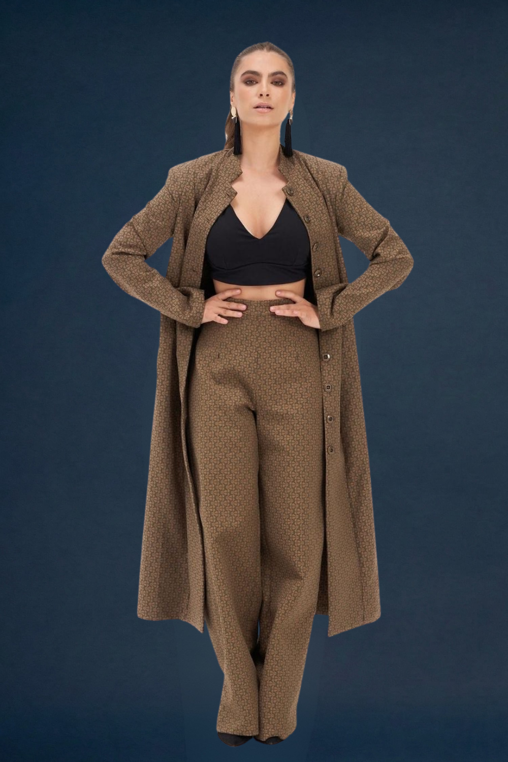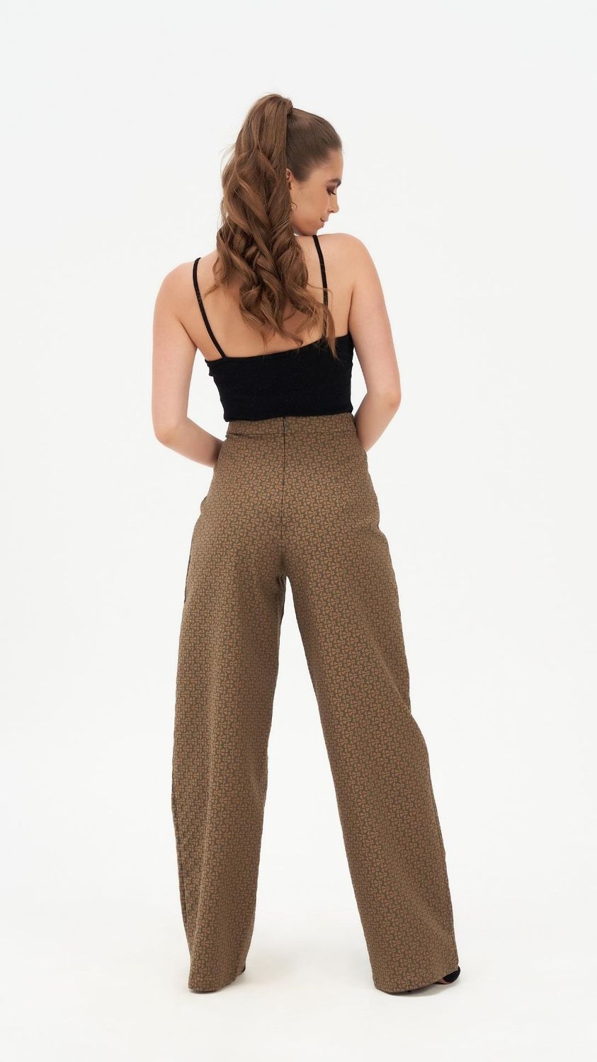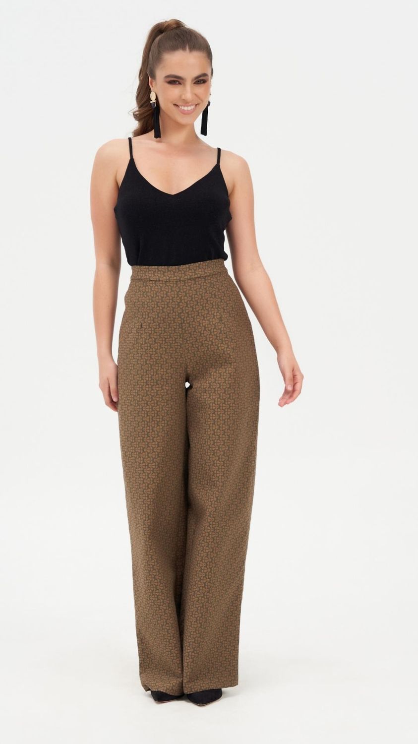 The Ivy Impressing Tailored Trouser is a high-waisted wide-leg pant in kalamata olive, cut from upcycled deadstock mosaic jacquard fabric. Made in Australia from 97% cotton and 3% elastane, the fabric holds its shape through a full day while moving comfortably with the body. The wide-leg silhouette and invisible back zip give the trouser a clean, uninterrupted line from waist to hem.