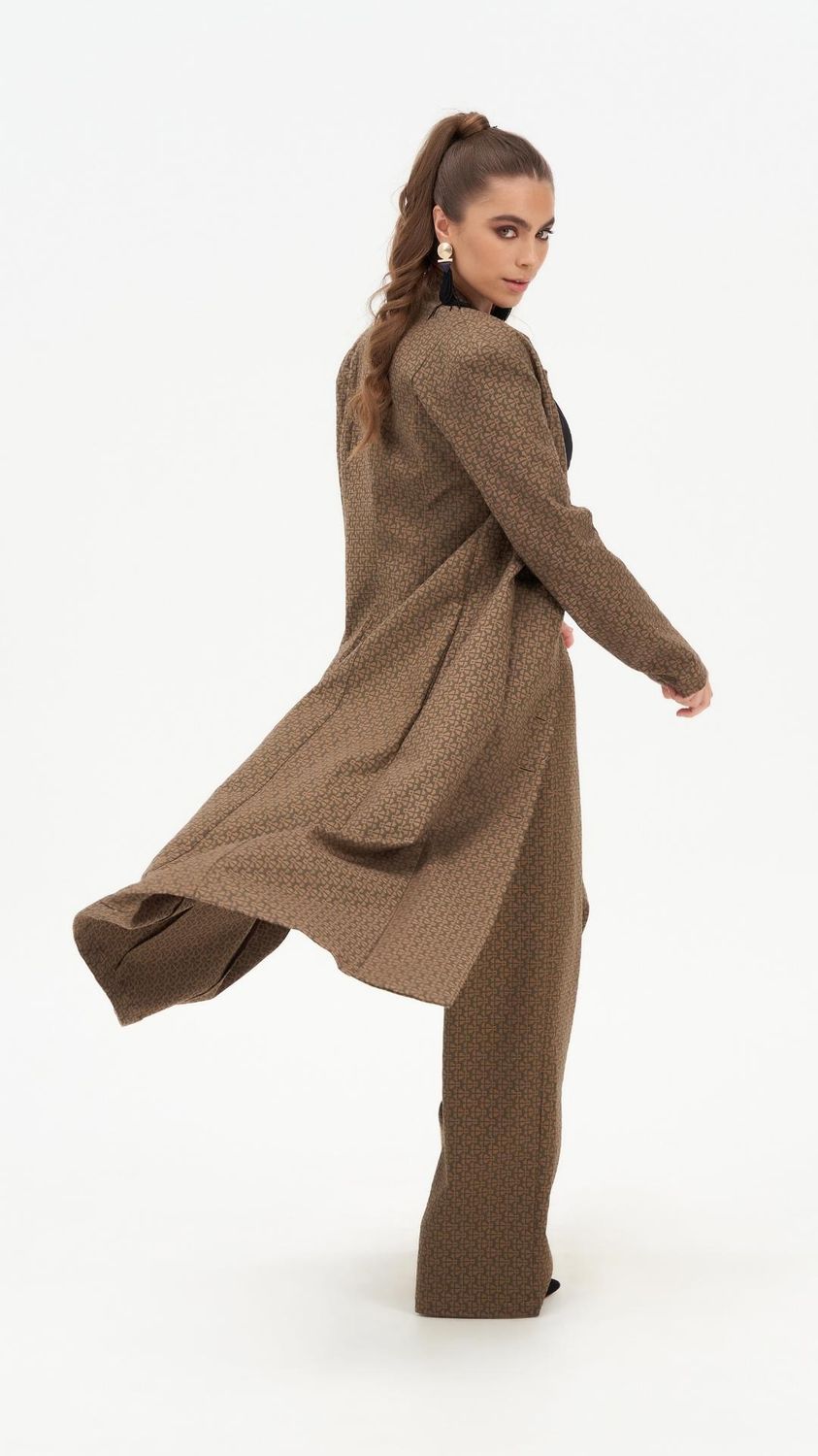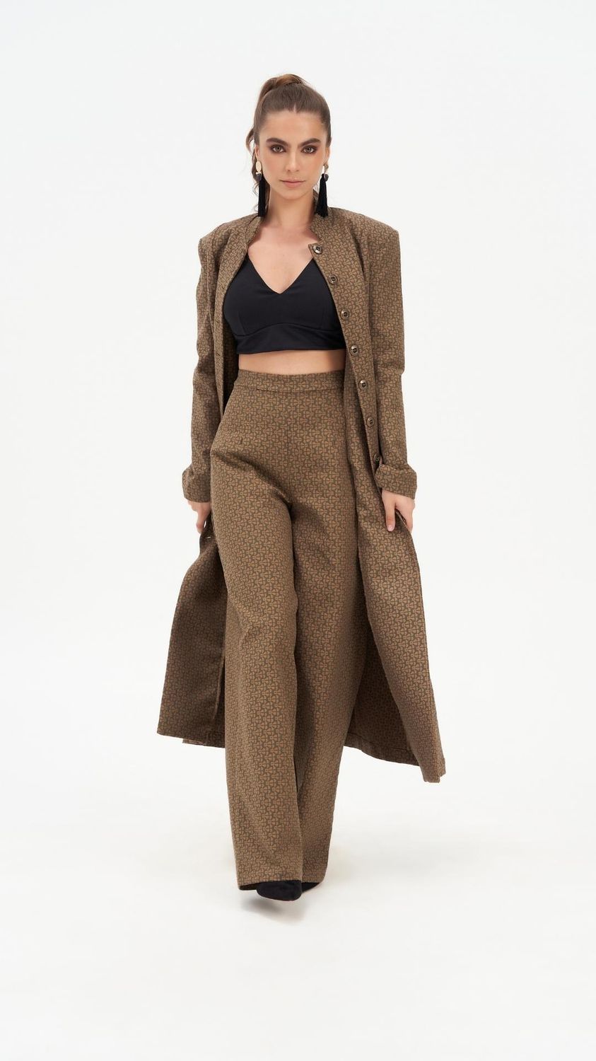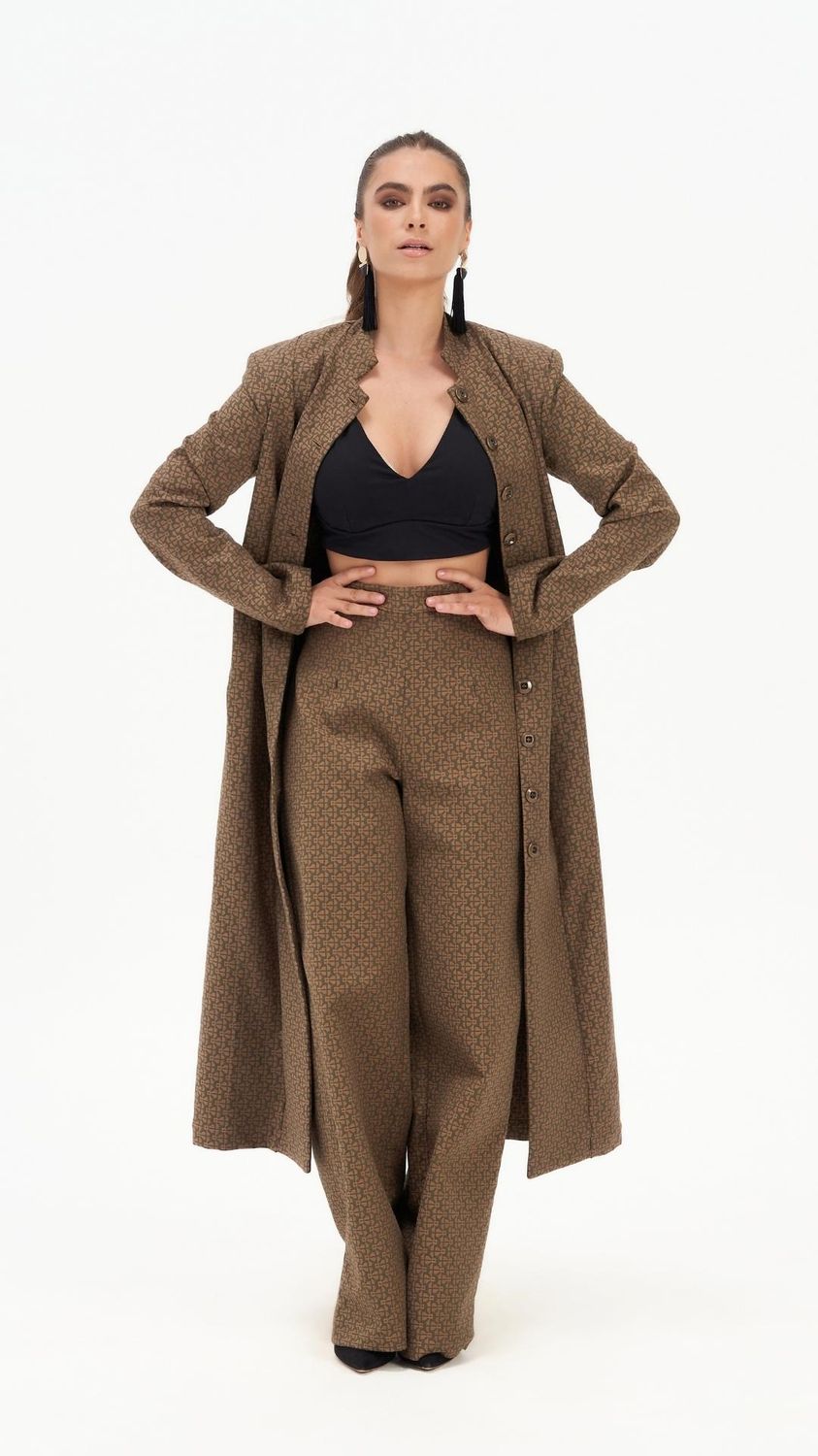 The Ivy Impressing Tailored Trouser is a high-waisted wide-leg pant in kalamata olive, cut from upcycled deadstock mosaic jacquard fabric. Made in Australia from 97% cotton and 3% elastane, the fabric holds its shape through a full day while moving comfortably with the body. The wide-leg silhouette and invisible back zip give the trouser a clean, uninterrupted line from waist to hem.