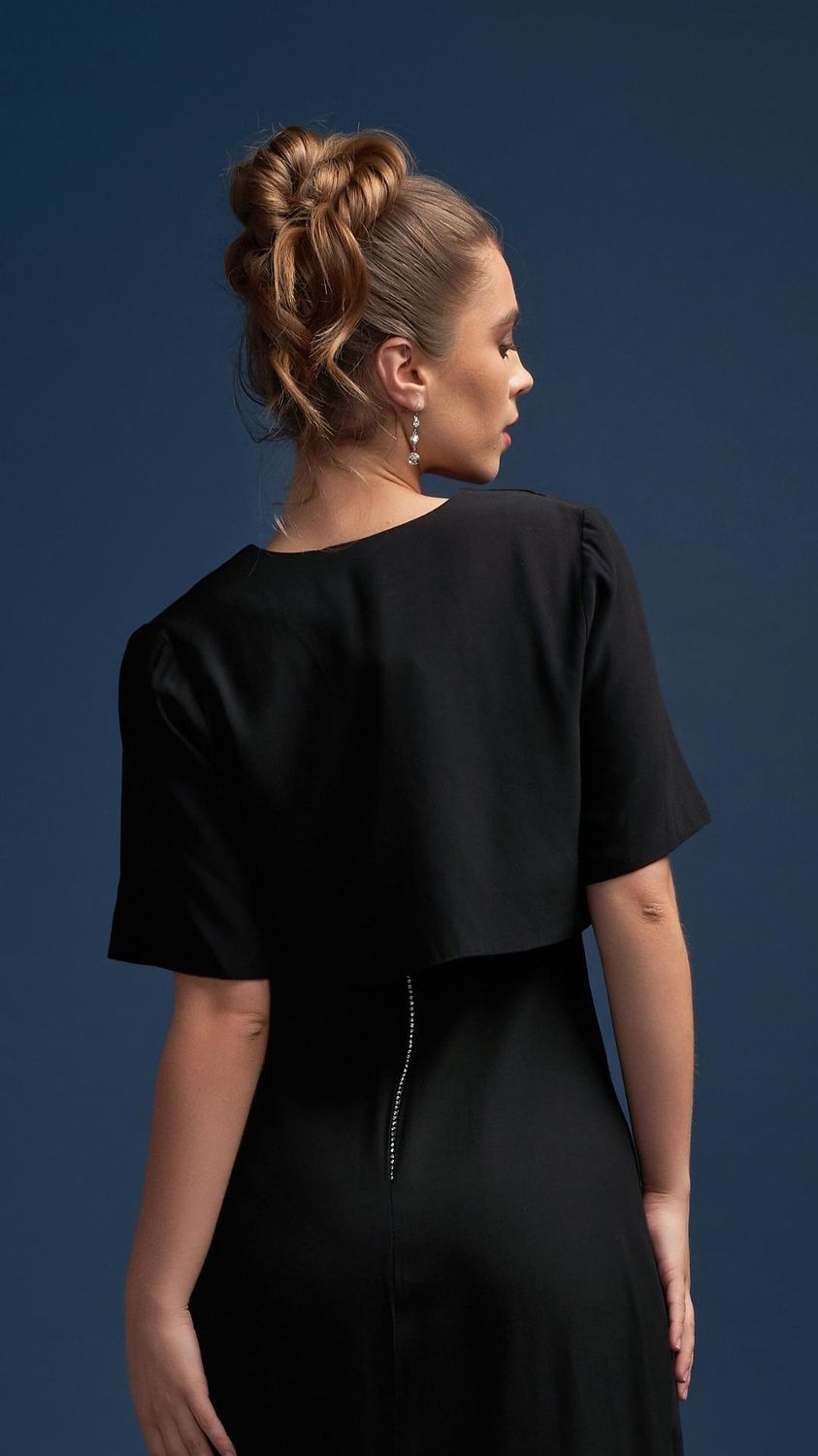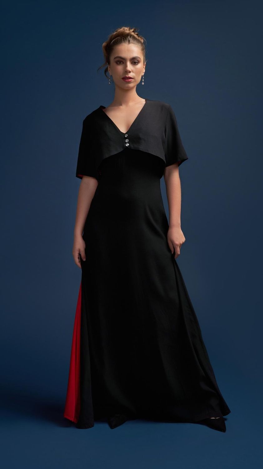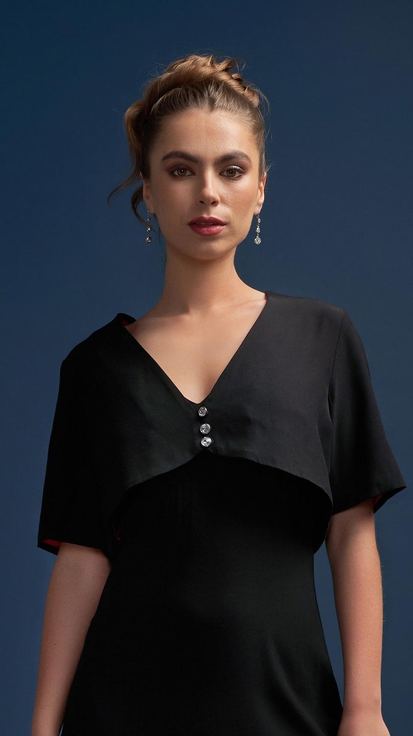 The Margaret Mesmerising is an evening bolero jacket with a detail that does all the talking — black on the outside, red on the inside. The striking contrast lining is revealed with every movement, adding drama to any evening dress underneath. Crystal buttons close the front with a dazzling, considered finish.